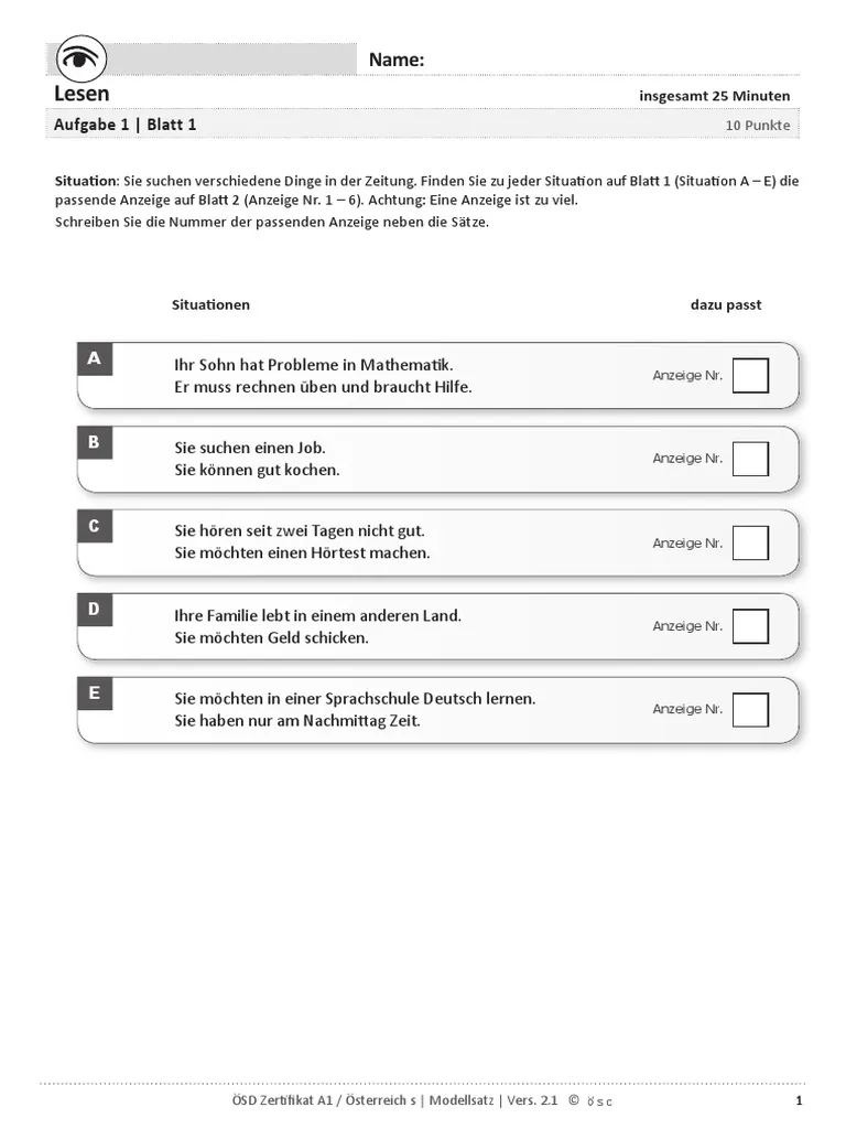 Ảnh minh hoạ đề thi mẫu ÖSD trình độ A1