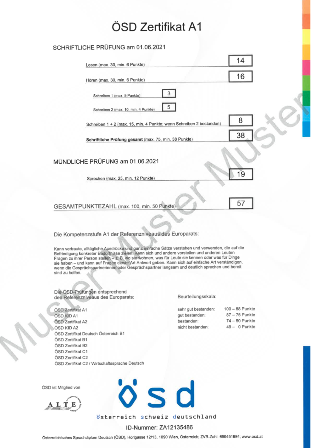 Bên cạnh đó, thí sinh còn phải đạt ít nhất 12 điểm ở phần thi Nói. Cuối cùng, tổng điểm của toàn bài thi (gồm Đọc, Nghe, Viết và Nói) phải đạt tối thiểu 50 điểm trên 100 mới được cấp chứng chỉ ÖSD A1 chính thức.